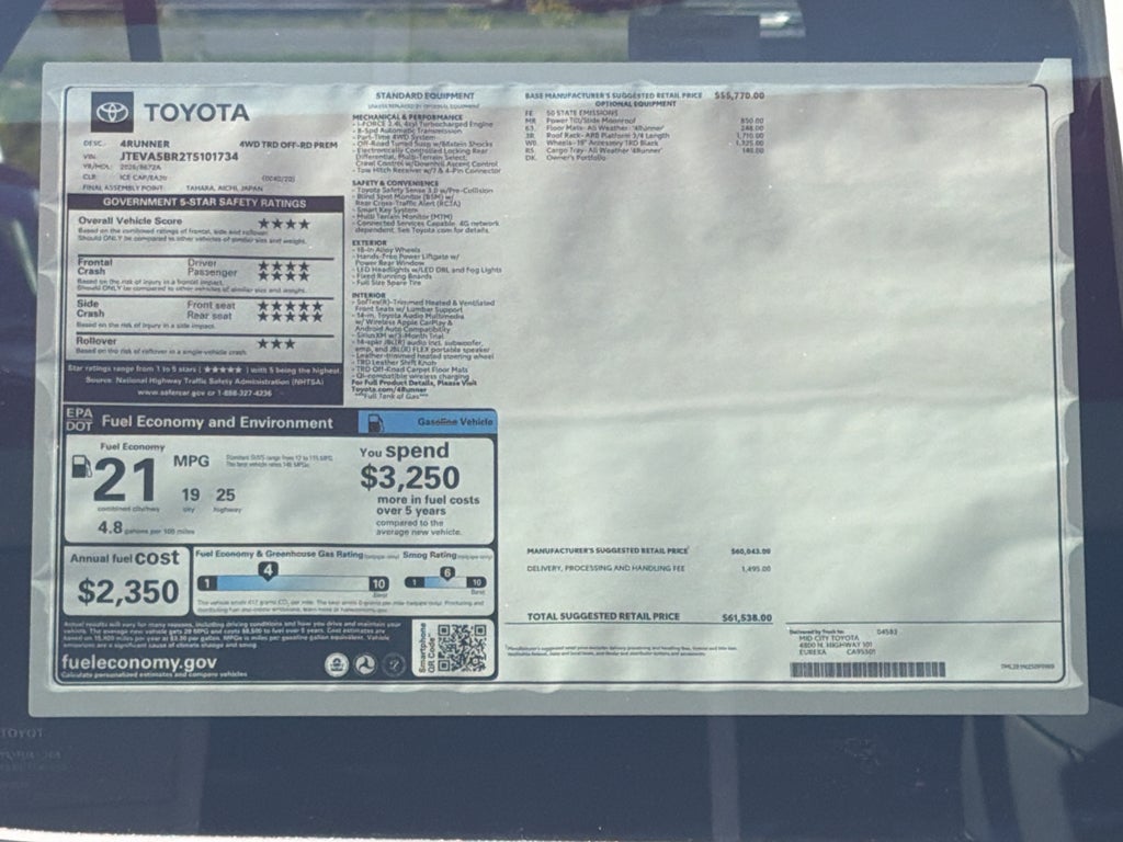 TRD Offroad Premium. ARB Platform 3/4 Length Roof Rack. 18" Accessory TRD Black Wheels. Moonroof. 4runner All Weather Floor Mats. 4runner All Weather Cargo Tray. **Equipment listed is based on original vehicle build and subject to change. Please confirm the accuracy of the included equipment by calling the dealer prior to purchase.**